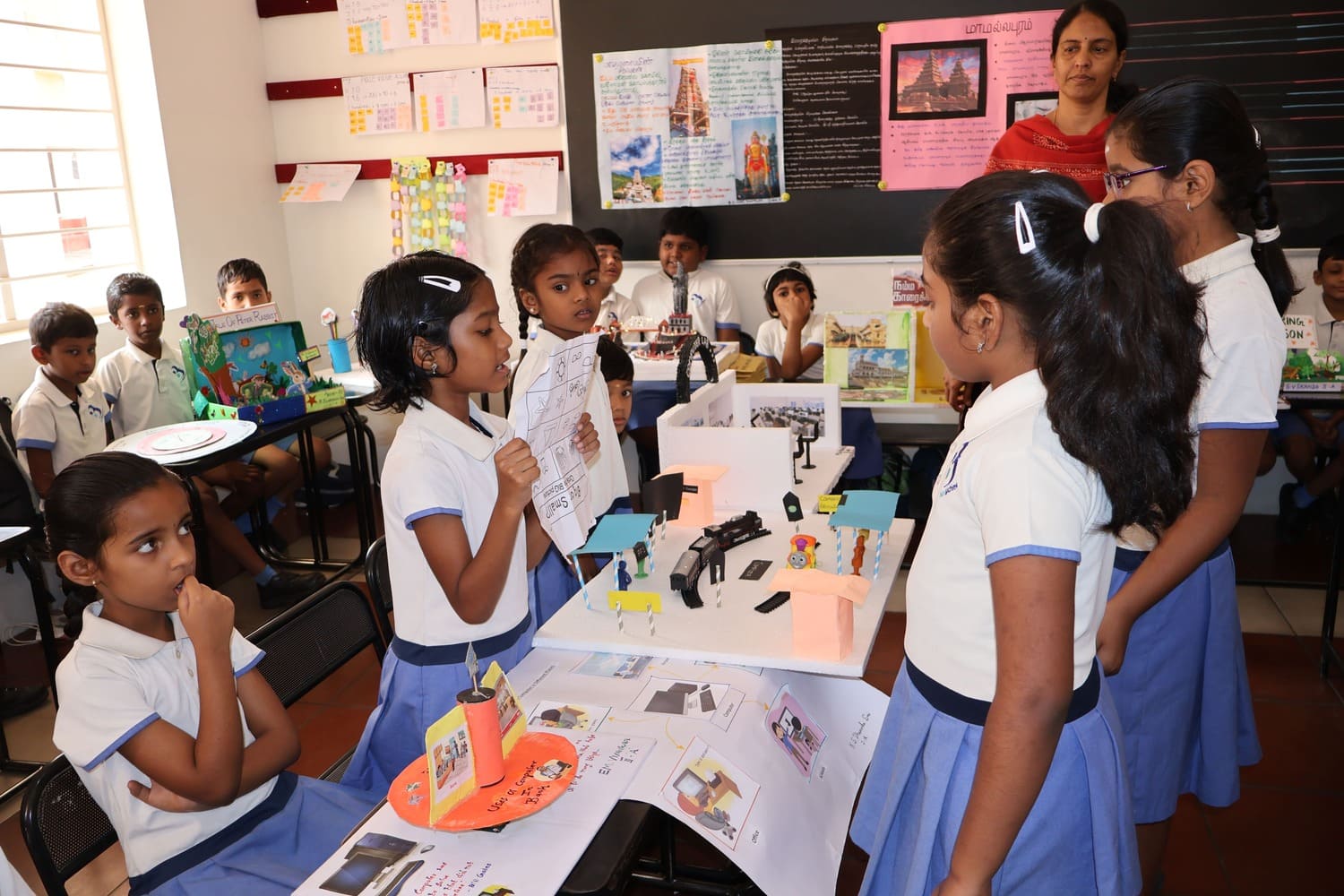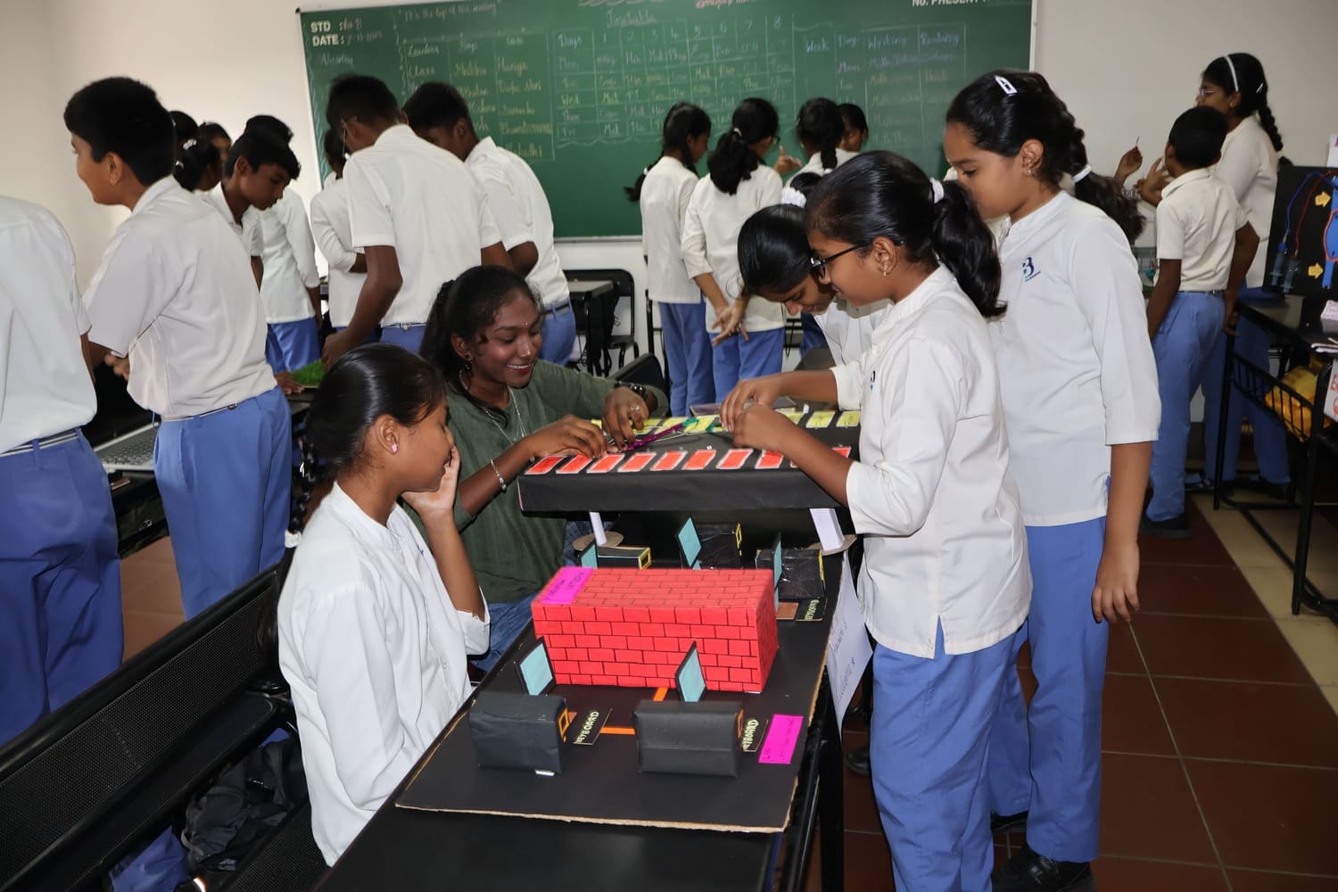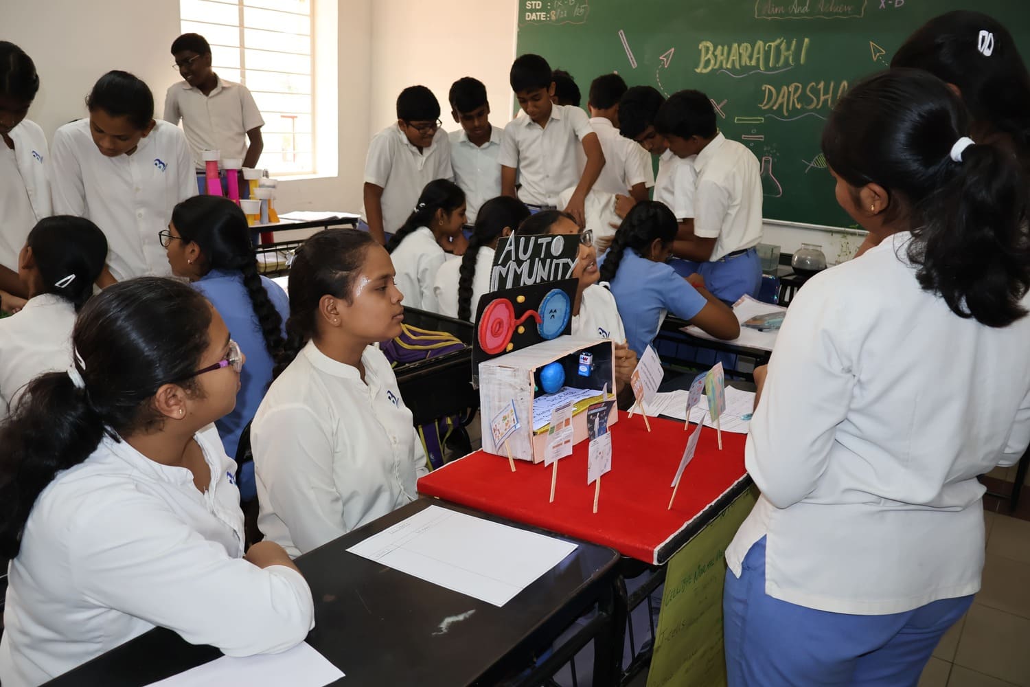 In the Language & Culture section, Tamil exhibits showcased the spirit of Tamil identity through art, language, and storytelling. The Hindi section exhibited the spirit of National Integration through posters, models, and student reflections. The "English Corner" featured interactive models that wove grammar, poems, prose, and literary legends into vivid displays. In the Science & Discovery section, students displayed a wide range of working models that blend engineering concepts with environmental consciousness, from hydraulic bridges and hydroelectric systems to solar-powered innovations and sensor-based systems. Chemistry's hands-on experiments sparked the audience's curiosity. Biology presents illustrated concepts such as microscopy, leaf structure, blood grouping, and others clearly and engagingly.