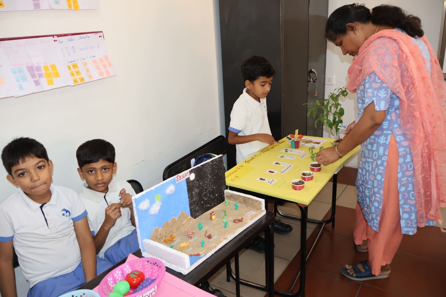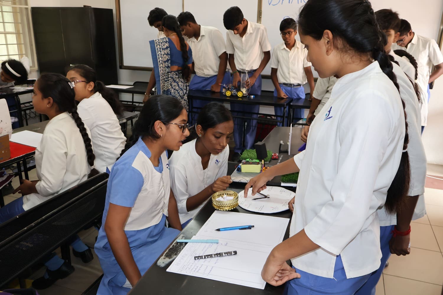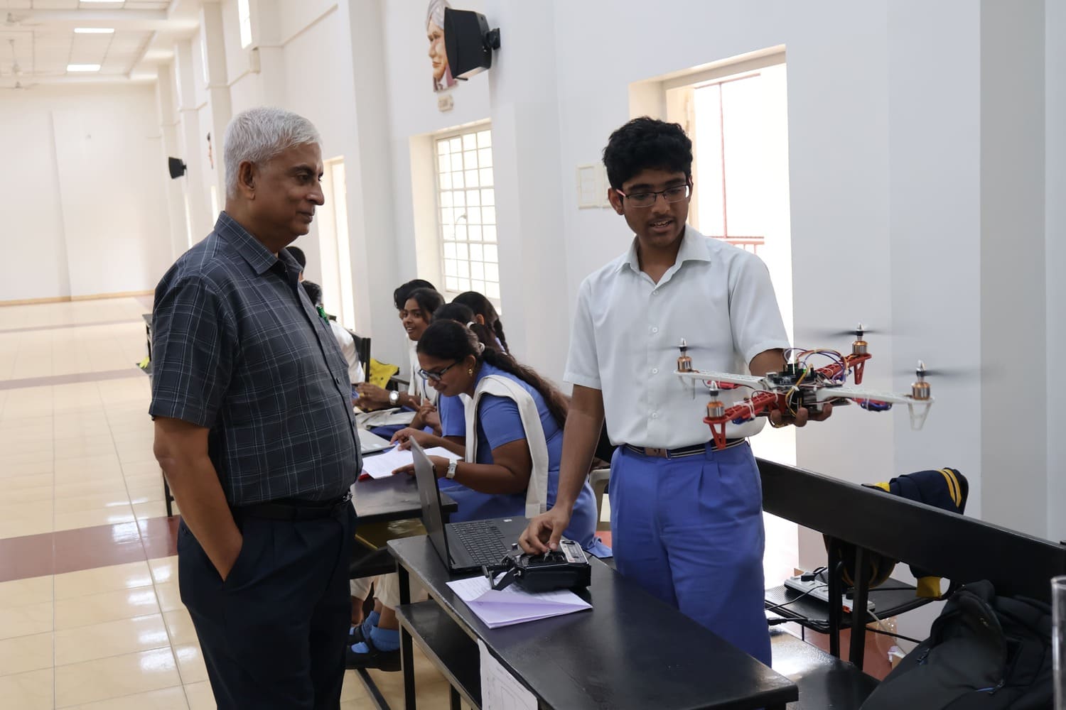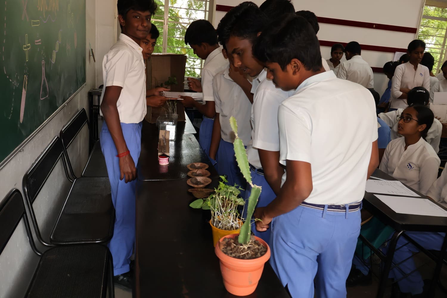 In the Language & Culture section, Tamil exhibits showcased the spirit of Tamil identity through art, language, and storytelling. The Hindi section exhibited the spirit of National Integration through posters, models, and student reflections. The "English Corner" featured interactive models that wove grammar, poems, prose, and literary legends into vivid displays. In the Science & Discovery section, students displayed a wide range of working models that blend engineering concepts with environmental consciousness, from hydraulic bridges and hydroelectric systems to solar-powered innovations and sensor-based systems. Chemistry's hands-on experiments sparked the audience's curiosity. Biology presents illustrated concepts such as microscopy, leaf structure, blood grouping, and others clearly and engagingly.