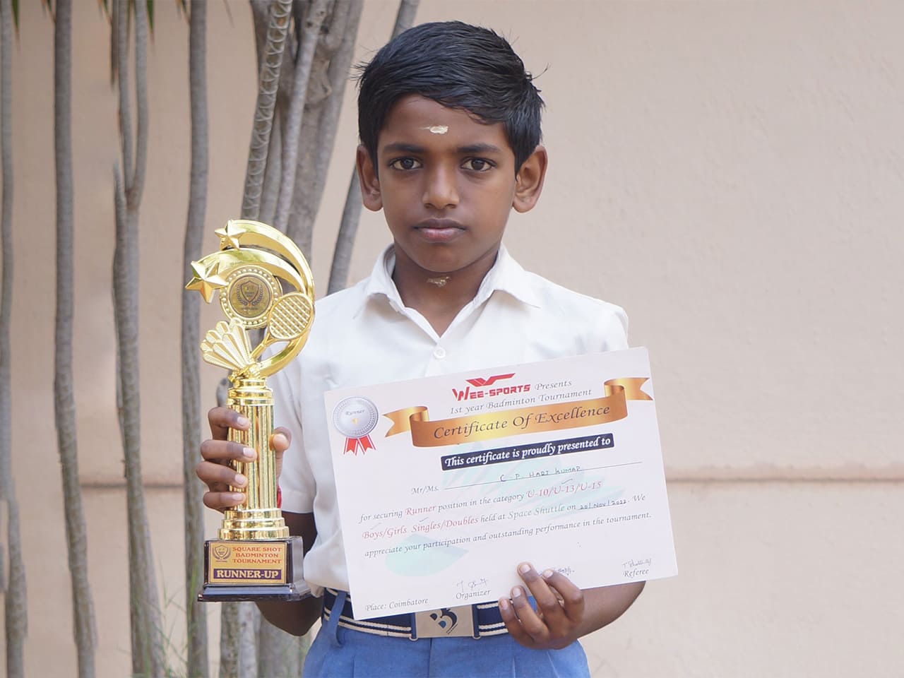 In the Wee Sports District Level Badminton Tournament held at Space Shuttle, Coimbatore, on the 20th of November 2022, Hari Kumar C P of Grade 6 bagged finished as the runner-up in the Singles (U-13 category).