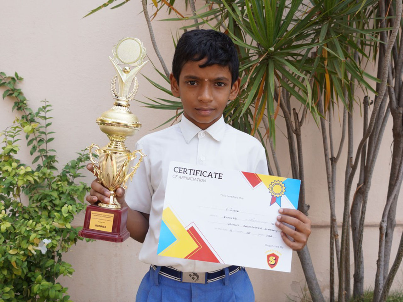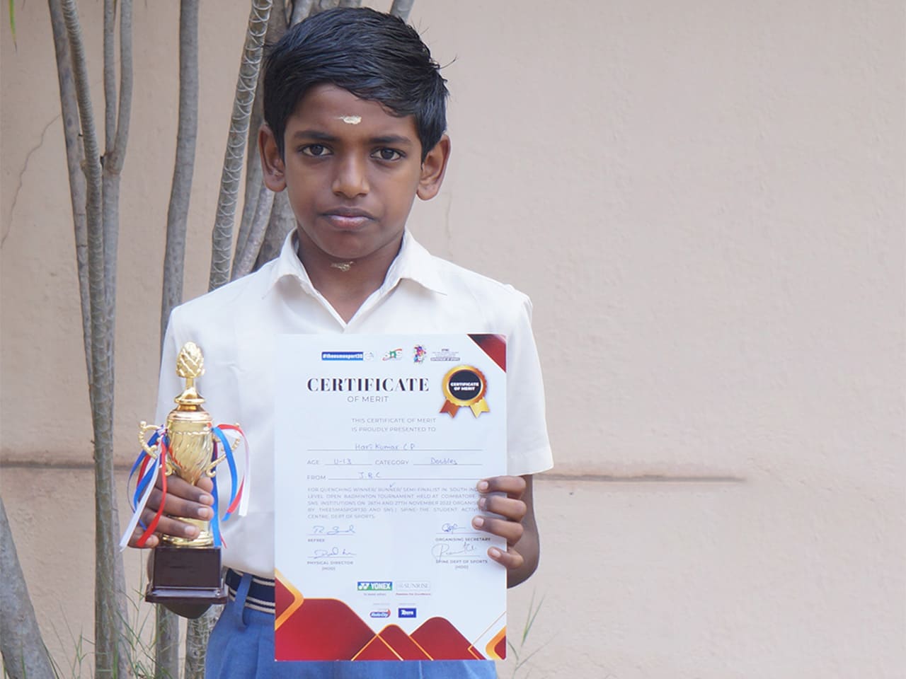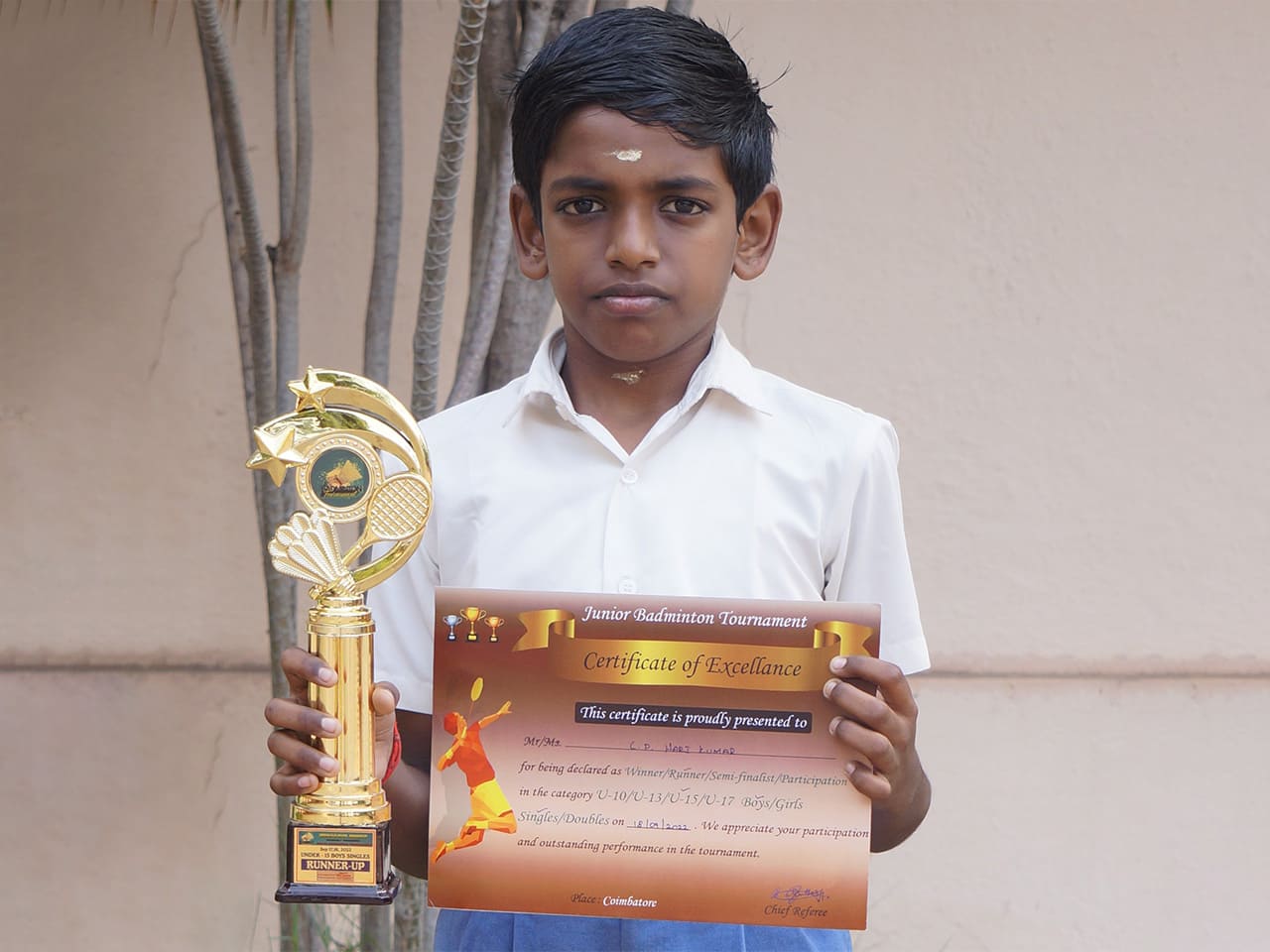 In the Junior & Sub Junior Badminton Tournament 2021-2022 held at Sai Vidhya Nikethan Matric Hr. Sec. School on the 25th of October 2022, Hari Kumar C P lifted the winner's trophy in the Singles (U-11 category).
