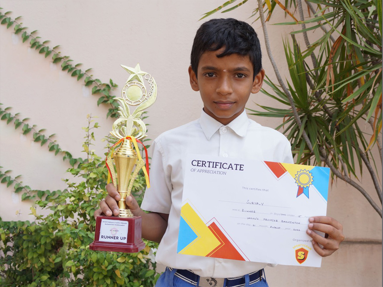 In the Yadhu's Premier Badminton Tournament organised by Sportygram on the 21st of August 2022, Surya V finished as the runner-up in the U-13 and U-15 categories respectively.