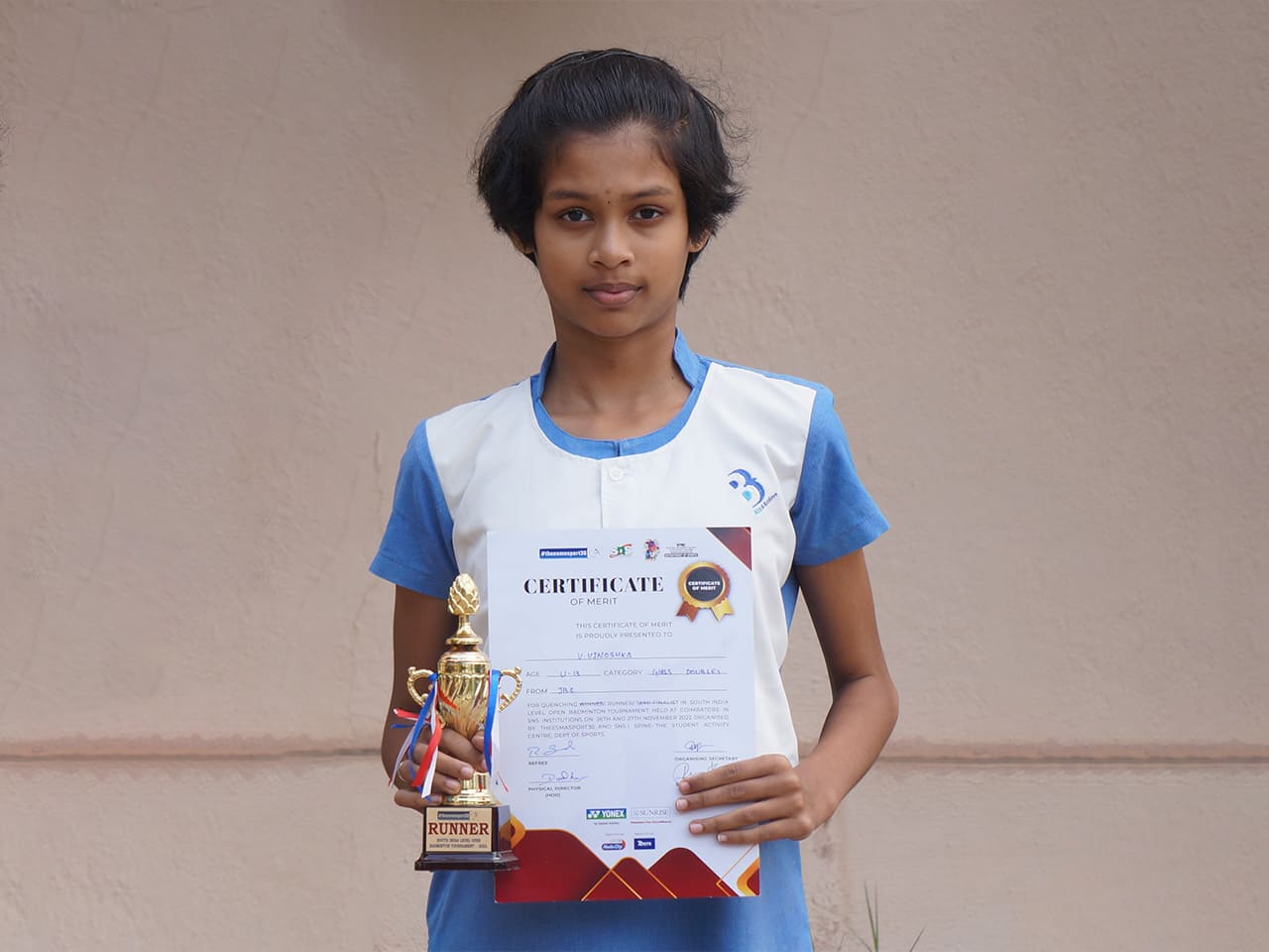 In the Junior Badminton Tournament held at Square Shot Badminton Academy, Coimbatore, o n the 17th and 18th of September 2022, Vaishnavi S (Grade 7 ) emerged as the title winner in the singles (U-13 category).