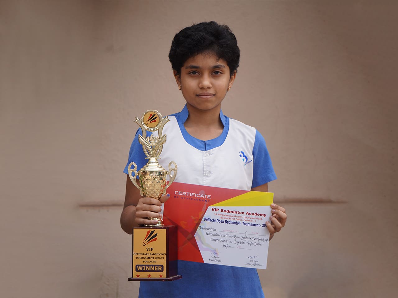 In the Pollachi Open State Badminton Tournament 2022, held at Pollachi on the 7th of September 2022, Vaishnavi S sealed the winner's title in the singles (U-13 category).